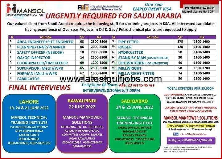 Our valued client from Saudi Arabia requires the following staff for upcoming projects in KSA, All interested candidates having experience in Overseas Projects in Oil & Gas / Petrochemical plants are requested to apply.