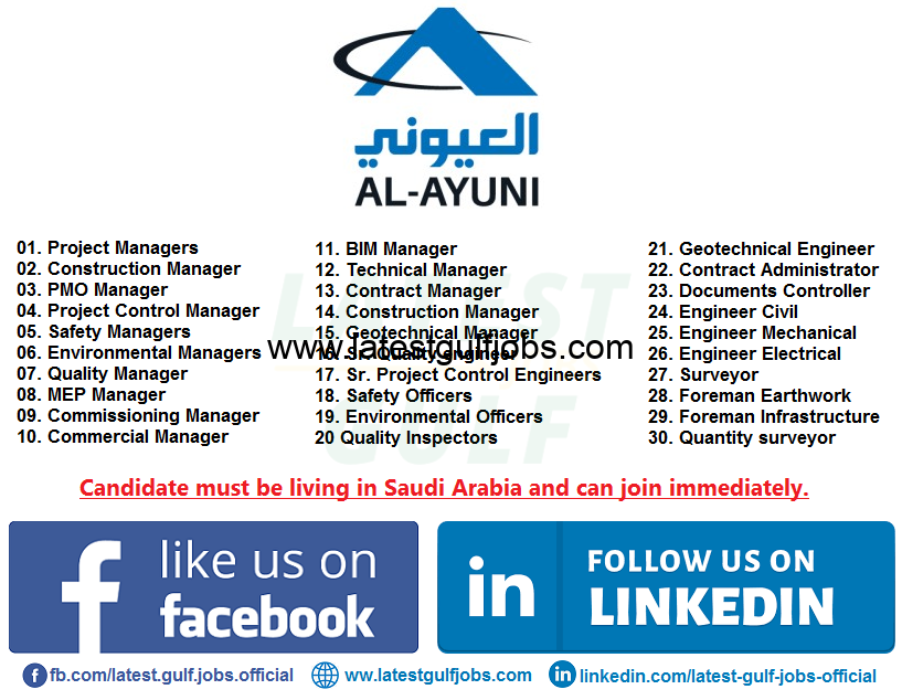 AL-AYUNI Investment and Contracting currently hiring professional field staff for its new ongoing project in NEOM City, Tabuk, & other locations Kingdom of Saudi Arabia.