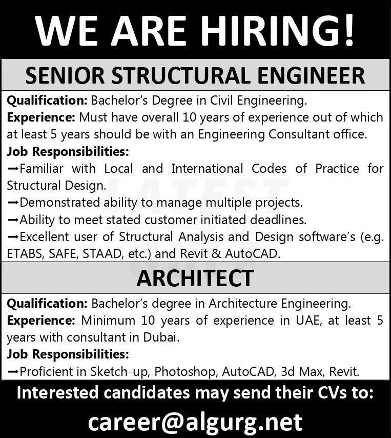 Al Gurg Consultants is currently hiring  for Senior Structural Engineer & Architect for their ongoing projects in Dubai, United Arab Emirates.