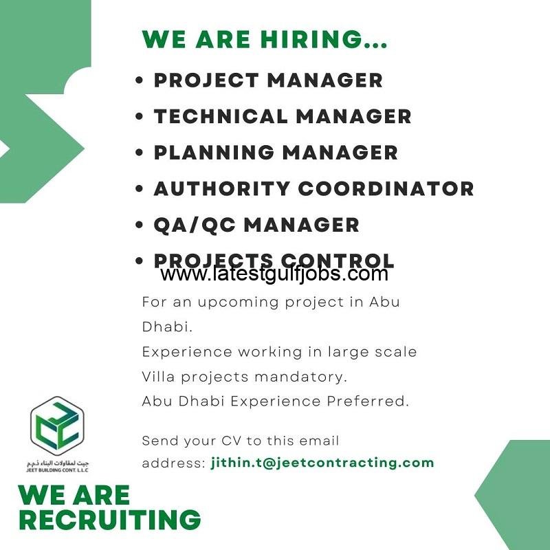 Jeet Building Contracting LLC hiring professional managerial staff for their upcoming Project in Abu Dhabi, United Arab Emirates.