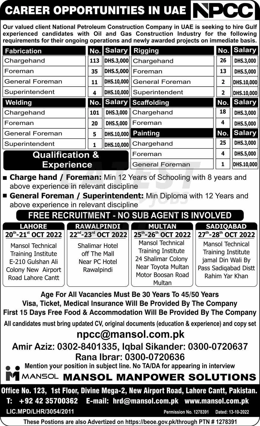 National Petroleum Construction Company in UAE is seeking to hire Gulf experienced candidates with Oil and Gas Construction Industry for the following requirements for their ongoing operations and newly awarded projects on immediate basis.