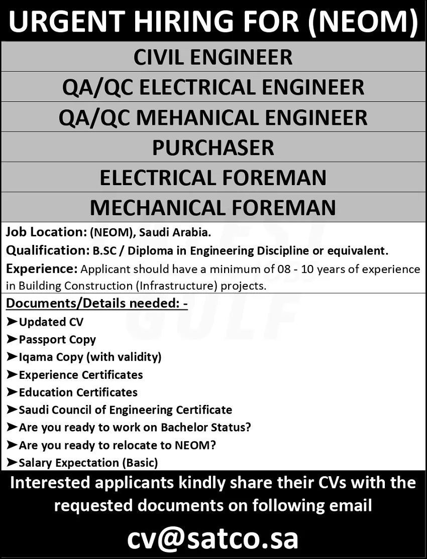 Saudi Arabian Trading and Construction Company (SATCO) has urgent openings for the below-mentioned positions for our project in Neom City, Tabuk, Saudi Arabia.